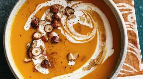 Découvrez la recette de velouté de potimarron au St-Moret et aux noisettes grillées. Parfait pour l'hivers, bon appétit!